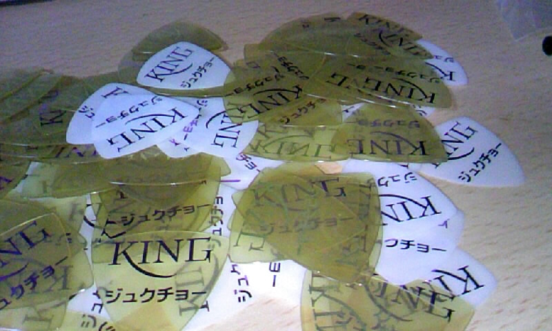 さてギター弾くかと思ってこのピックを手に取ると、そぉーか俺はKINGだったよな。と無理矢理テンションが上がるのである。絵師のムッシュ氏は色々なパターンを作ってくれたが、結局「KING ジュクチョー」に独断で決定。